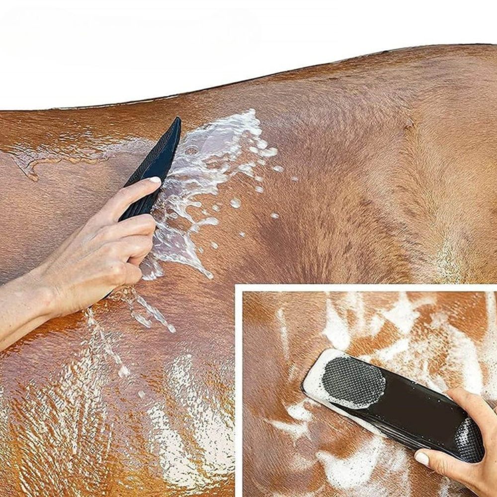 Denne børste fungerer også som en massager, der blidt stimulerer blodcirkulationen og holder din hest afslappet og rolig. Dens ergonomiske form sikrer et behageligt greb, der hjælper dig med at pleje med præcision og lethed. Uanset om den bruges i stalden eller før ridning, gør den plejen effektiv og stressfri. EquiGlow hjælper dig med at yde skånsom pleje, samtidig med at du sparer tid og kræfter.