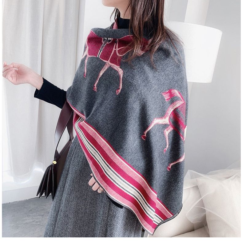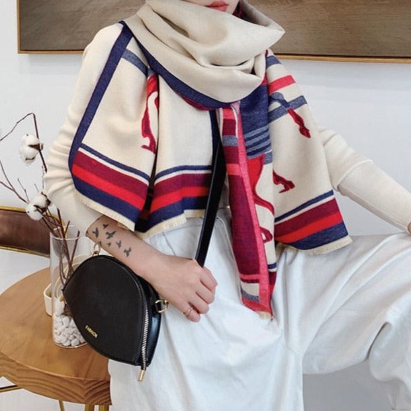 Dette sjal har ingen lukninger eller bånd, hvilket holder dets struktur åben og alsidig til flere stylingmuligheder. Overfladen er jævnt vævet og giver en subtil glans i lyset. Den rektangulære silhuet gør det nemt at folde og drapere i forskellige stilarter, uanset om det er viklet én gang, bundet eller båret som hovedbeklædning. Med sin enkle konstruktion og slående visuelle mønster tilføjer det nemt dimension til hverdagslooks eller raffinerede outfits.