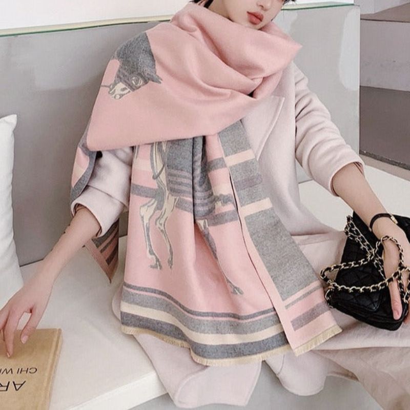 Diana wrap-sjalet har en flagrende fald og et bredt snit, designet til et yndefuldt lagdelt udseende. Dets printmønster tilføjer et dynamisk element, der spænder fra abstrakte til symmetriske motiver afhængigt af variationen. Kanterne er afsluttet med korte, delikate frynser, der giver tekstur og en følelse af bevægelse. Dets generøse dimensioner gør det velegnet til styling over skuldrene, viklet om halsen eller båret løst som en kappe.