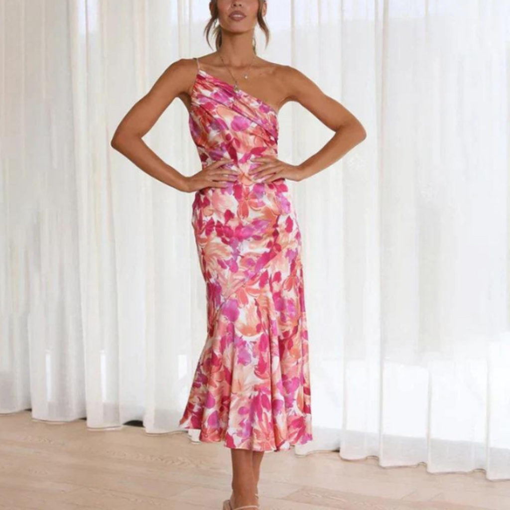 Omfavn din indre fashionista med denne moderne en-skulder kjole. Det udsøgte blomsterprint giver et forfriskende farvestrejf, mens den unikke halsudskæring skaber et elegant og dristigt look. Ideel til bryllupper, havefester eller en romantisk aften ude, denne kjole vil helt sikkert få dig til at føle dig lige så smuk, som du ser ud.