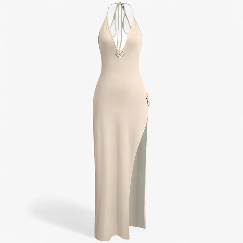 Denne bodycon-kjole tilbyder en elegant, figursyet silhuet med en slående rosetdetaljer, der løfter stilen. Den høje slids tilføjer et element af dristighed og skaber en perfekt balance mellem sofistikeret og dristigt.