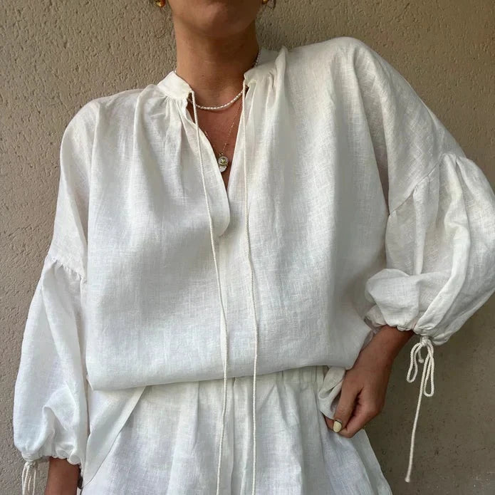 Træd ind i den ubesværede elegance i dette todelte sæt. Med en top med afslappet pasform med lanterneærmer og matchende shorts med flæsedetaljer er dette ensemble perfekt til varme, solrige dage. V-udskæringen og bindebåndsdetaljerne tilføjer et strejf af sofistikering, hvilket gør den velegnet til både afslappede udflugter og mere påklædte lejligheder.